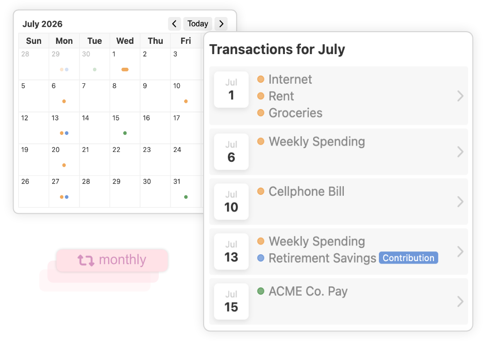 Keep track of your income, expenses due, savings history so you'll never miss a due date. Set up recurring income and expense items to create a clearer financial picture.